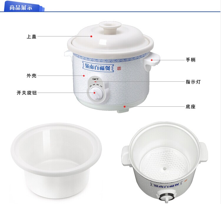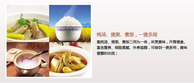 功能介绍 ● 采用新型专利晶格反射传热方式,具有聚能、热效率高、加热均匀稳定的功能; ● 精选优质原料独家打造的陶瓷内胆—“景德尚品”,炖汤香味四溢。 ● 集炖汤、煲汤、煮饭三用为一体; ● 利用全自动控温程序,只需放入烹煮原料,选好档位即可,安全方便; ● 具有保温特性和节能的效果; ● 外观高贵典雅,尽显品味。