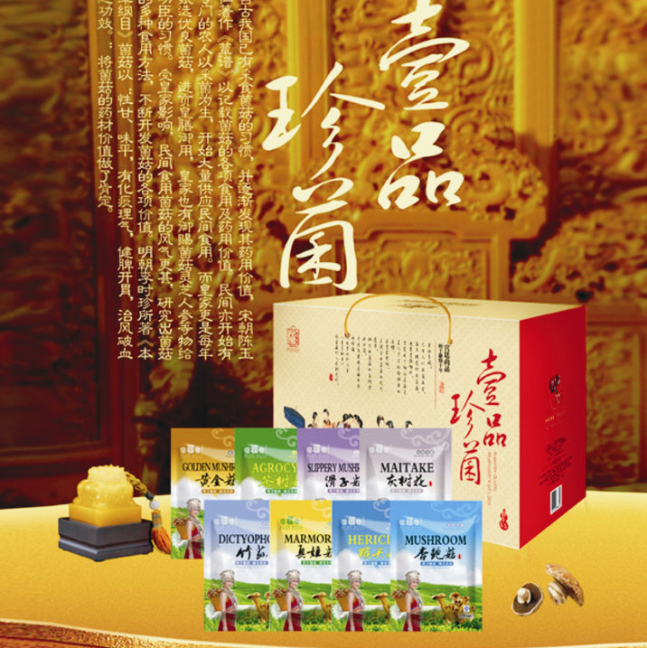 内置配件:特级真姬菇188g、特级猴头菇158g、特级滑子菇148g、特级茶树菇168g、特级灰树花98g、特级竹荪 38g、特级杏鲍菇148g、特级黄金菇128g。