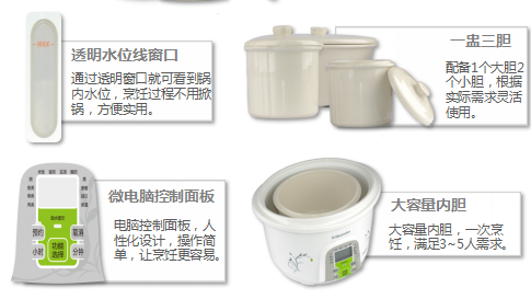 功能简介: 1.内钢外塑双层结构,聚能省耗,安全防烫 2.隔水柔炖,以精确控温,全面促进食物营养成分的提取 3.多陶瓷内锅组合,可同时炖煮不同食物,不用分次炖煮 4.多重安全保护系统,确保产品使用安全